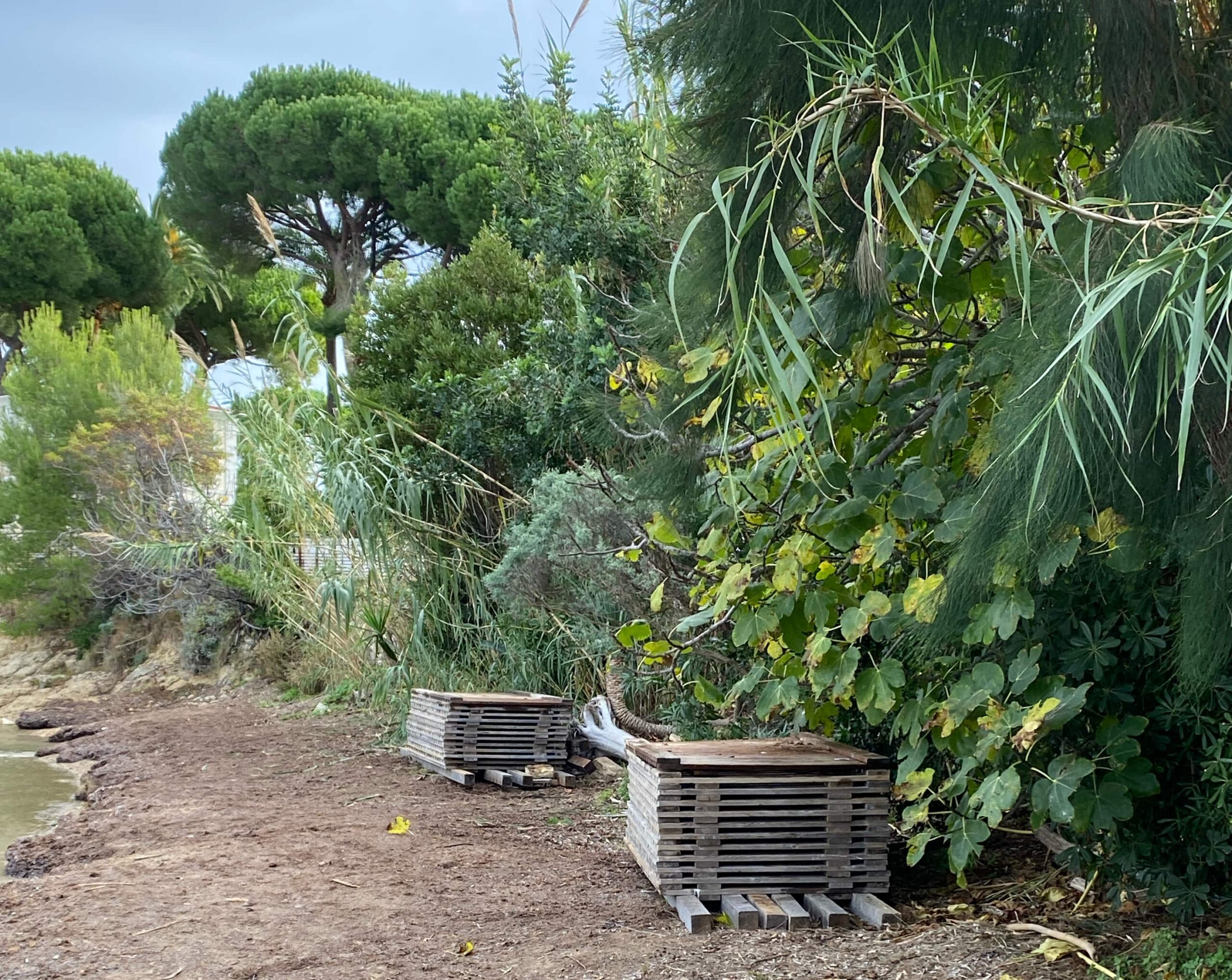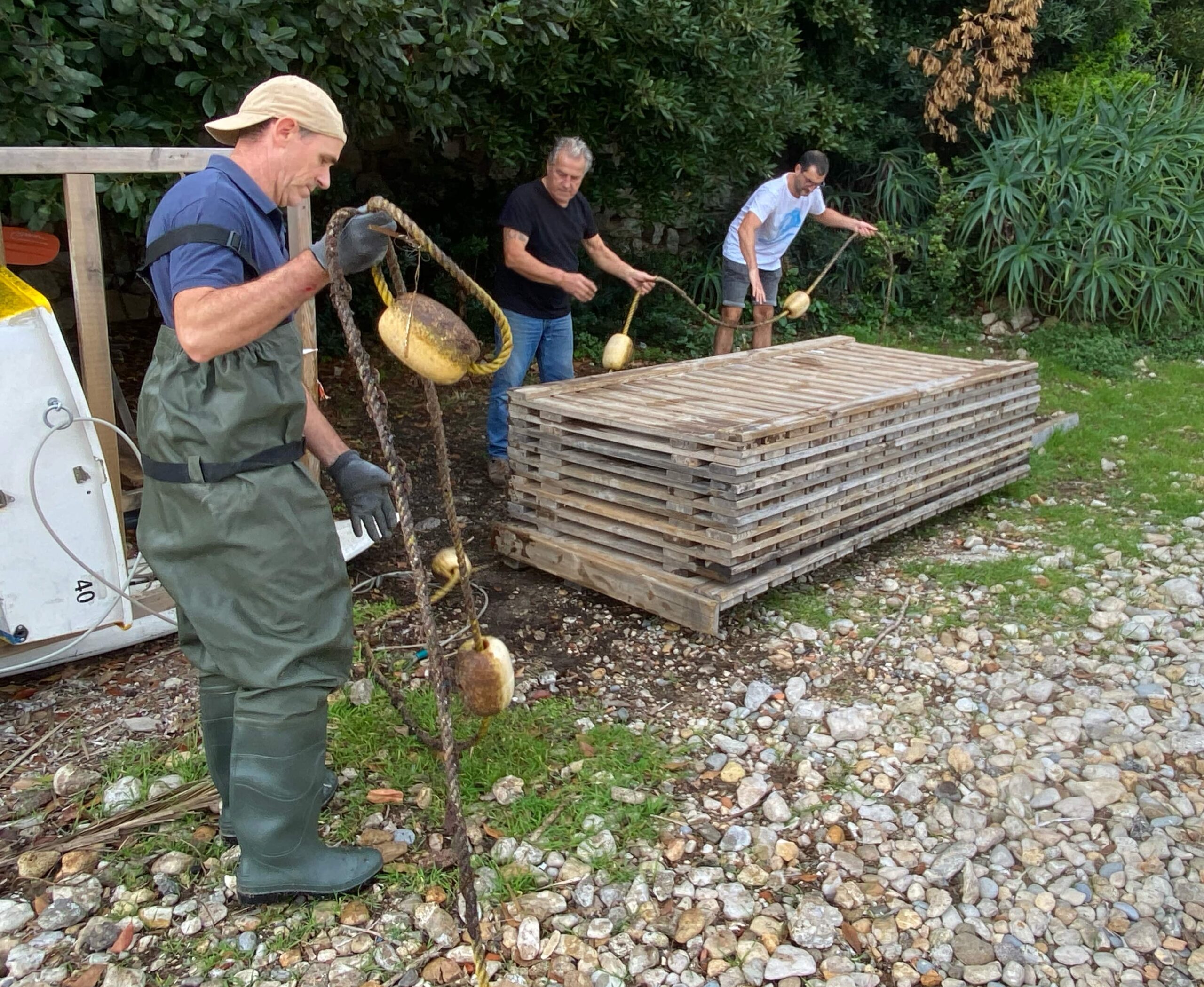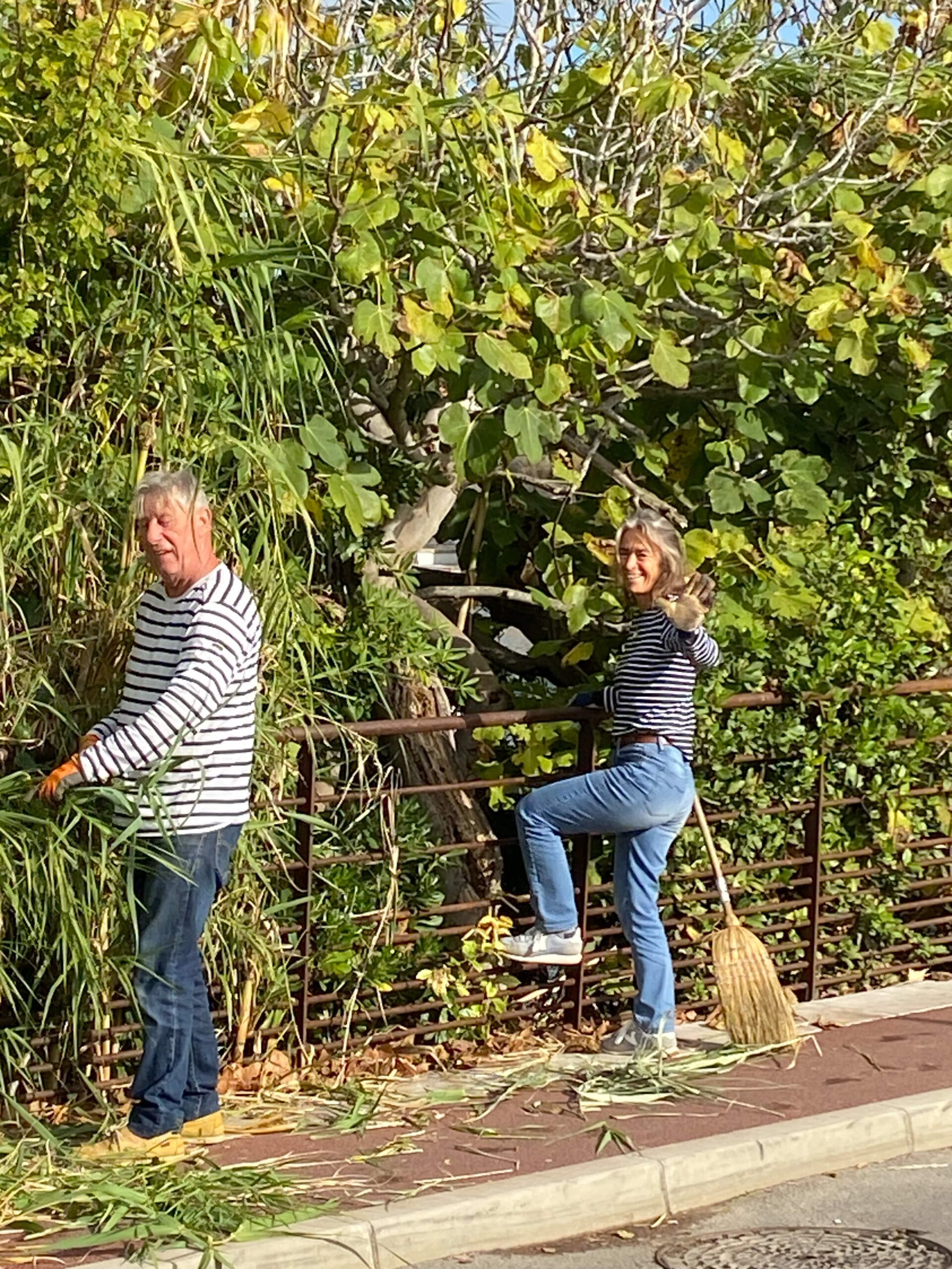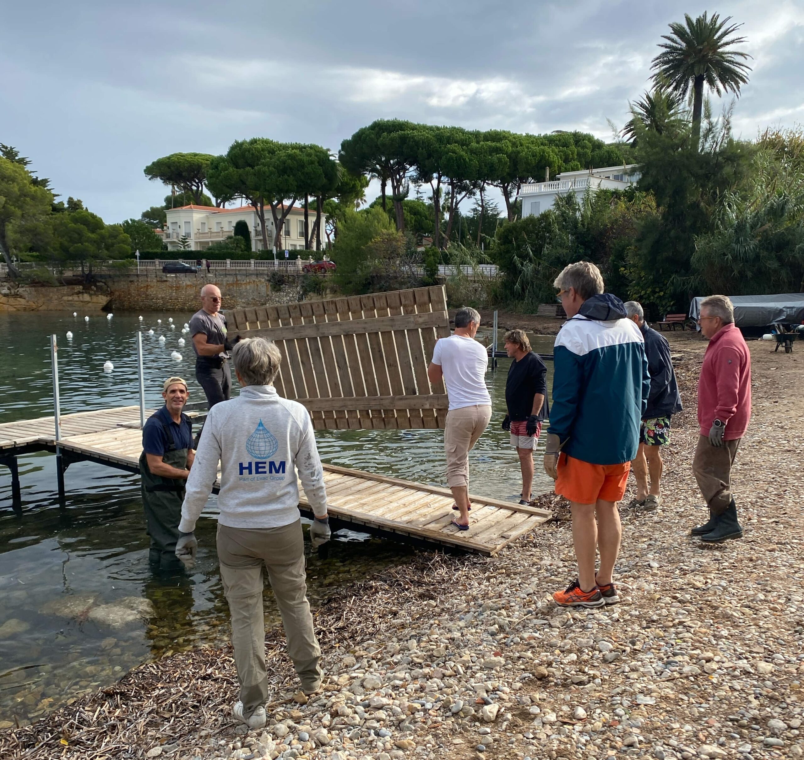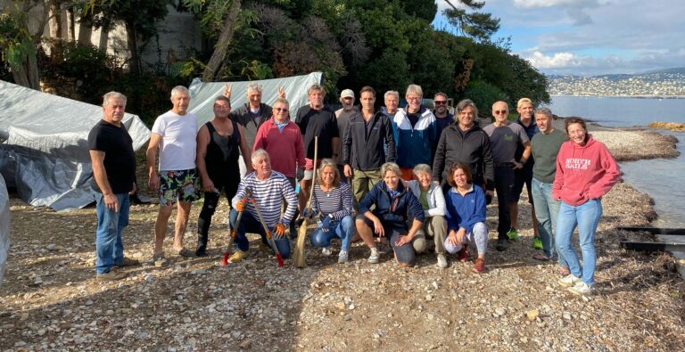 Quelle équipe ! A l’oeuvre dés 8h00 sur le site de nombreux adhérents étaient présents pour gérer différents ateliers de travail menés en parallèle pour optimiser le travail de la matinée. L’atelier nettoyage du site et taille des végétaux s’est attelé à couper les branches proches de la route, à regrouper feuillages, cannes cassés et bois flotté en tas permettant un meilleur écoulement des eaux de pluie et pour faciliter la circulation entre les bâteaux à terre. L’atelier des pontons s’est occupé à proprement parlé du démontage et du stockage, avec un regroupement des boulons et fixations dans la remorque de l’association pour un stockage incluant les lignes d’eau et les bouées. Après cet effort collectif, un dernier apéritif a été offert aux participants. La matinée s’est clôturée par le départ du dernier pointu pour le port de Golfe-Juan: Yvonne a été tractée après un problème moteur.