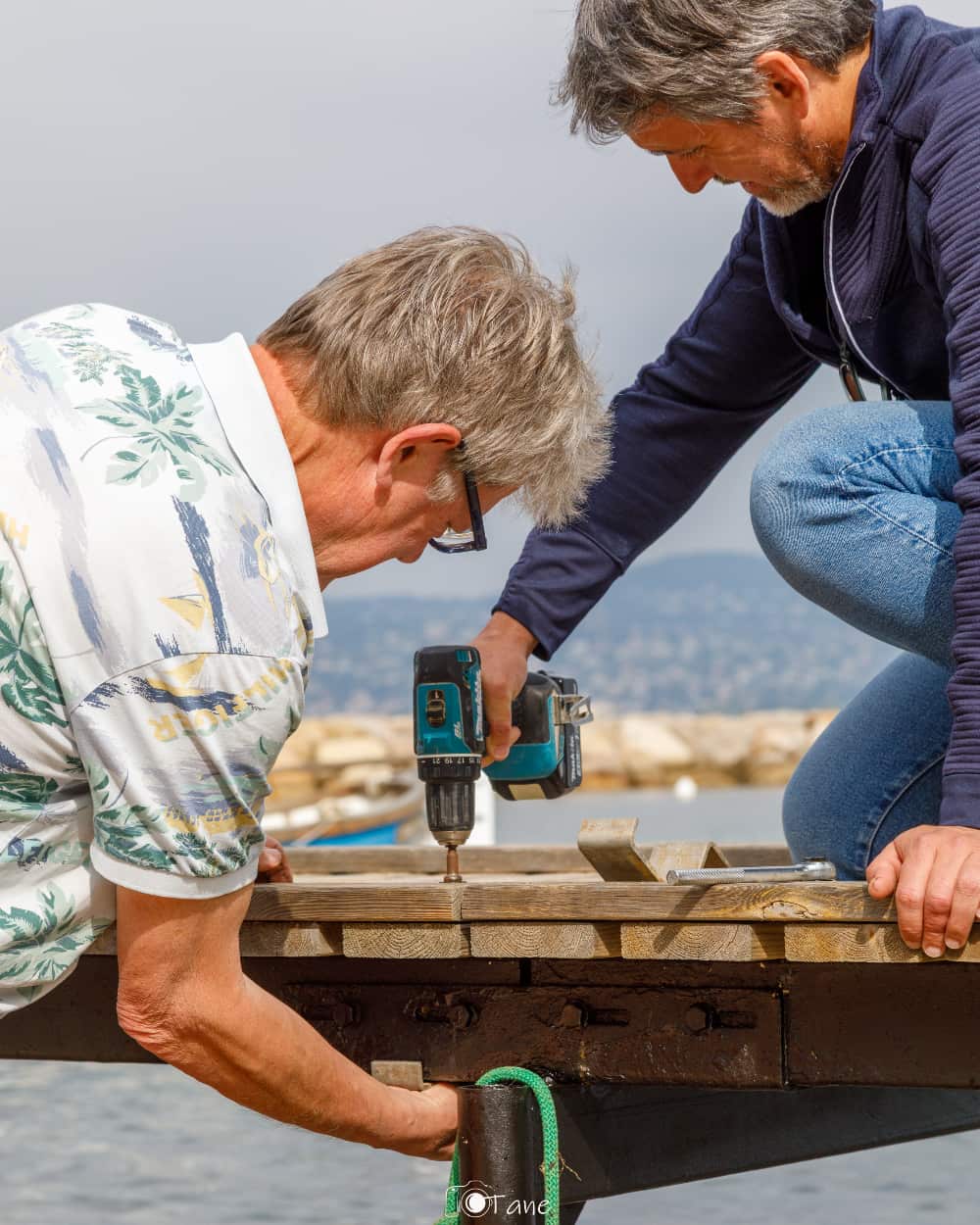 Dans la continuité des travaux réalisés le week-end précédent — , remise en peinture et traitement contre la rouille — les éléments étaient prêts à être réassemblés. Les planchers ont ainsi retrouvé leur place sur les structures portantes, dans une dynamique collective désormais bien rodée. Les portillons ont été remontés ainsi que la signalétique des obligations et règles d’accès aux pontons. Les caisses de boulons, les clés de serrage, les équerres circulent de main en main avec fluidité. Chacun·e s’inscrit dans une chaîne d’actions coordonnées — positionnement, boulonnage, serrage, ajustage — contribuant à une progression à la fois rapide et sécurisée. Ce travail collectif, fondé sur l’expérience accumulée, illustre pleinement l’esprit de coopération qui anime le port.